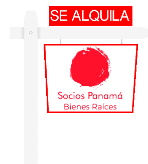 Animated real estate sign for rent from Socios Panamá Bienes Raíces, featuring a red circle logo and clear text.