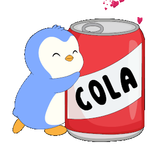 An adorable blue penguin lovingly hugs a red cola can, surrounded by floating hearts, expressing affection for the fizzy drink.