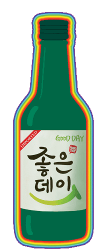 A vibrant green bottle of Good Day Soju with a rainbow border, featuring Korean text and an "IMPORTED" label.