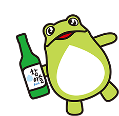 A cheerful green frog holds a bottle of Cham-iseul soju, with a pink heart floating nearby, ready to celebrate.