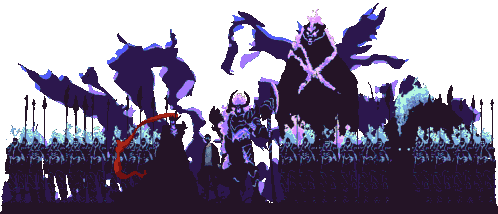 A dramatic pixel art scene from Solo Leveling featuring Pkzeray and a vast army of shadowy figures and colossal creatures.