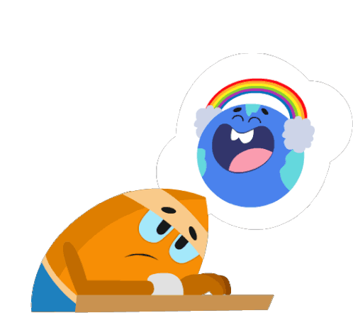 Sonar, a sad, bandaged character, rests its head, dreaming of a happy Earth with a rainbow and headphones, expressing feelings of sadness and longing.