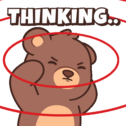 A cute brown bear with a thoughtful expression, hands on its cheeks, with 'THINKING..' text above its head.