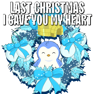 A cheerful Pudgy Penguin winks while singing 'Last Christmas I Gave You My Heart' amidst a festive blue wreath.