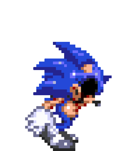 Sonic Exe, a pixel art horror character, spins with a large, bloody mouth and a spiked weapon.