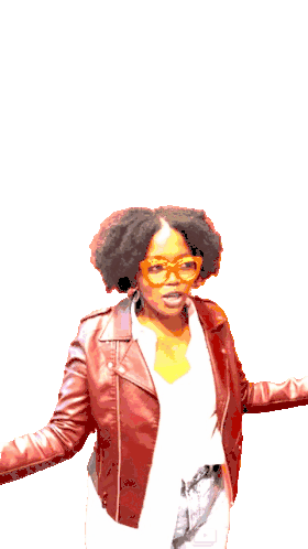 Athandiwe making a "call me" gesture, wearing a red leather jacket and orange glasses, with an expressive look.