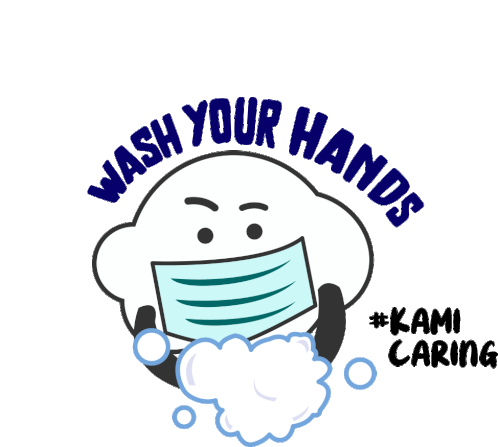 An animated sticker from Caring Pharmacy featuring a masked cloud character washing hands, with the message 'Wash Your Hands' and '#KAMI CARING'.