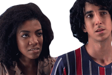 Man with an awkward, fake smile from Porta Dos Fundos, while a woman looks on with a slight grimace.