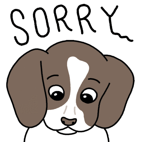 A cute cartoon puppy with big, sad eyes and floppy ears bobs its head, expressing an apology with the word 'SORRY' above it.