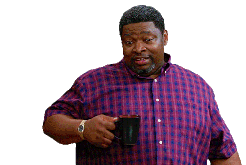 Curtis Payne, portrayed by Lavan Davis, reacts with wide eyes, holding a coffee mug, as the caption 'Sounds Expensive' appears.