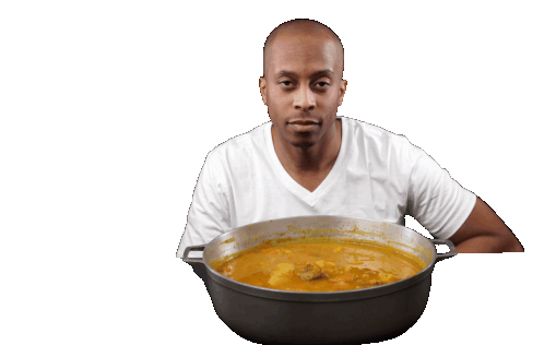 A man in a white t-shirt stirring a large pot of traditional Haitian Soup Joumou, a rich squash soup, with a wooden spoon.
