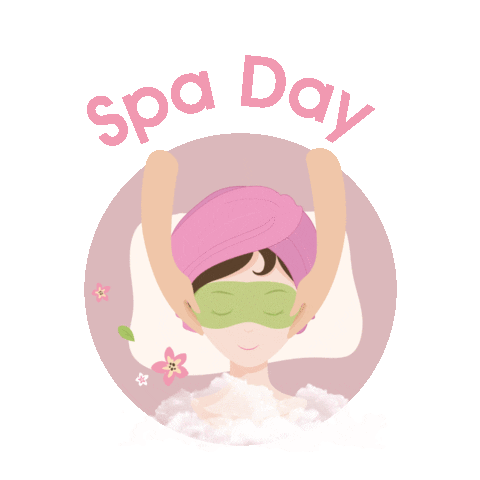 A cartoon woman with a pink towel and green eye mask enjoys a relaxing spa day facial with gentle hands and bubbles.