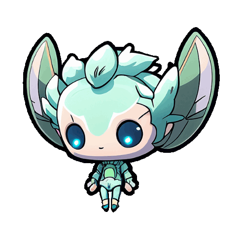 An adorable chibi-style alien creature with large glowing eyes and delicate wings, floating in space. Perfect for cosmic cuteness.