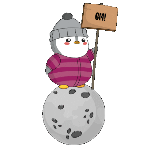 A cute Pudgy Penguin, possibly Lil Pudgys, stands on the moon holding a 'GM!' sign, ready for space adventures.