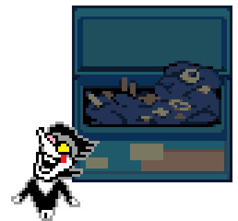 Animated sticker of Spamton from Deltarune, excitedly punching a large blue dumpster, showcasing his energetic personality.