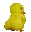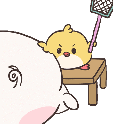 A cute yellow chick playfully swats a large white creature's rear with a fly swatter.