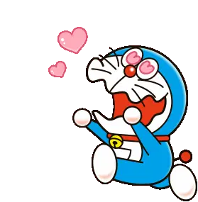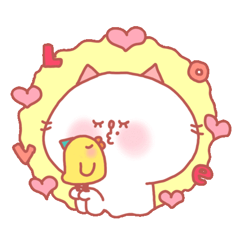 An adorable cartoon cat tenderly kisses a small yellow bird, surrounded by sparkling hearts and the word 'LOVE', expressing affection.