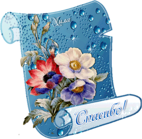 A beautiful animated sticker featuring a bouquet of red, white, and purple flowers on a blue scroll, with 'Спасибо!' (Thank You!) in Russian.