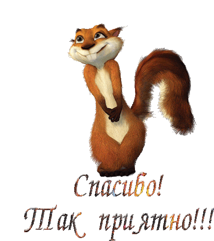 A cheerful animated squirrel character expresses gratitude with the Russian phrase 'Thank you! So pleasant!'