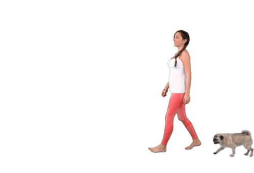 A woman walks barefoot with her pug dog. The dog follows closely behind her, enjoying a leisurely stroll.