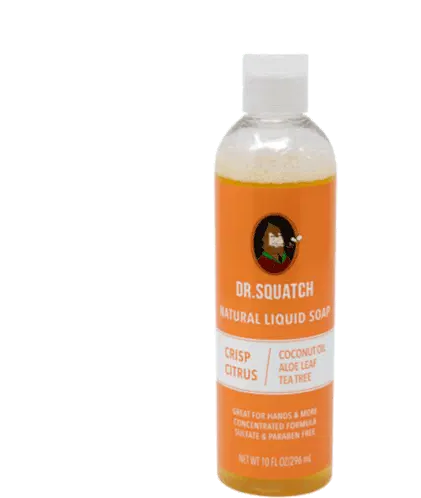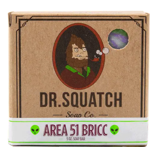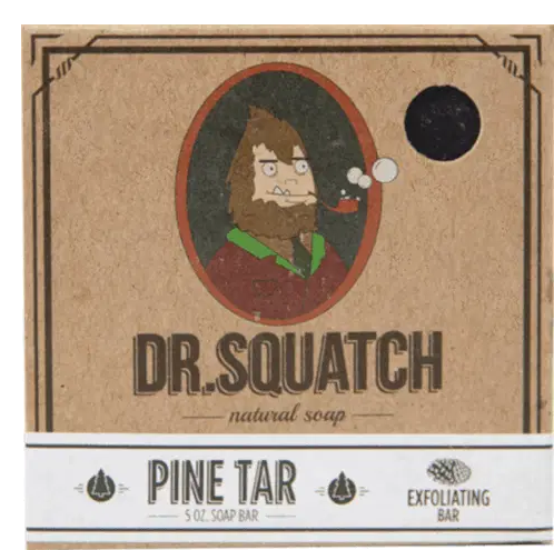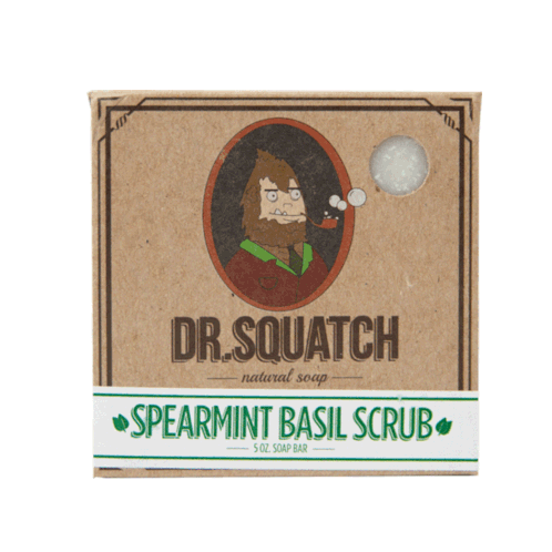Animated sticker featuring Dr. Squatch Spearmint Basil Scrub natural soap packaging, showcasing the product and brand.