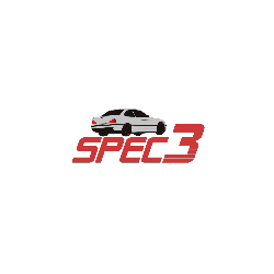 Animated pixel art sticker featuring the Spec3 racing logo and a white car silhouette, shrinking on a white background.