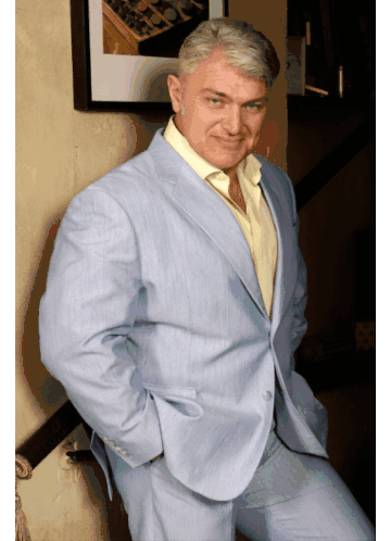 a man in a light blue suit and yellow shirt is leaning against a wall