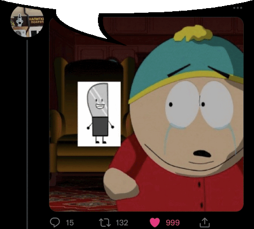 a cartoon character with a knife on his head and a speech bubble that says " напитки "