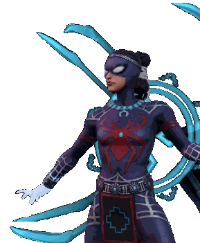 Spider-Weaver, a powerful character from Marvel Strike Force, in her distinctive dark suit with a red spider emblem and glowing energy.
