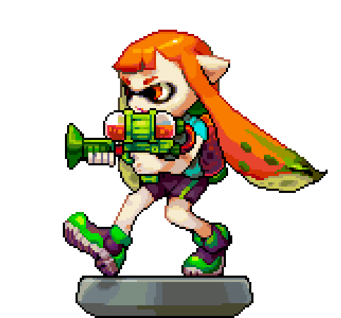 A vibrant pixel art sticker of an Inkling from Nintendo's Splatoon, ready for action with a water gun.