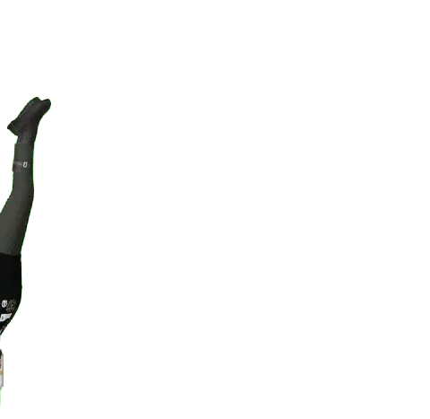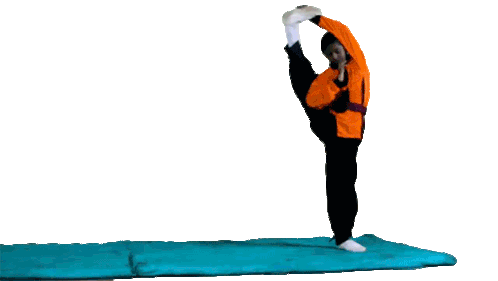A person demonstrates impressive flexibility by performing a standing split, holding their leg high in a gymnastics pose.