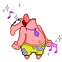 Patrick Star from Spongebob Squarepants dances energetically with music notes and sparkles.