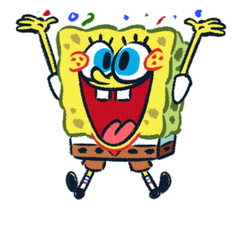 Spongebob Squarepants celebrates with a wide smile, holding spatulas as colorful confetti falls around him.
