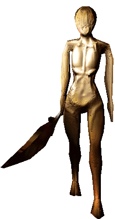 Spooky'S Jump Scare Mansion Bab, a golden, low-poly figure, stands menacingly with a large, sharp weapon.