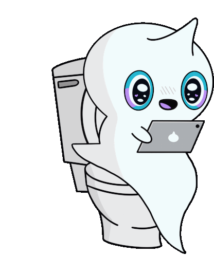 Spoopy Naru, a cute ghost character, sits on a toilet engrossed in a tablet, perfect for a humorous bathroom break.