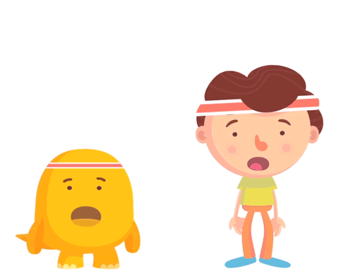Two animated cartoon characters, a yellow blob and a boy, energetically performing jumping jacks together.