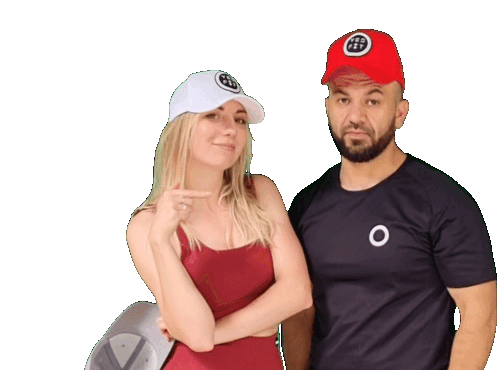 Jamal and a woman in sports attire, both wearing caps, pointing. The woman points at Jamal, who then points forward.