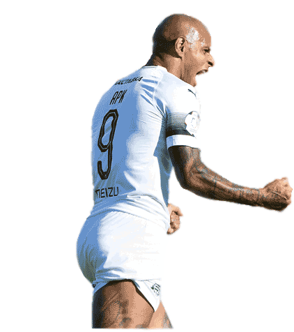 Football player Ari from FC Krasnodar celebrates a goal with an excited shout and clenched fist.