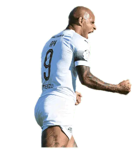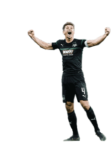 Martynovich of FC Krasnodar celebrates a goal with arms raised and a joyful shout, wearing his team's black and green kit.
