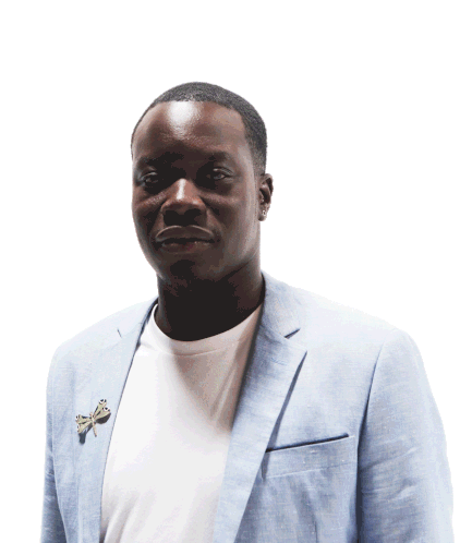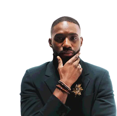 Abou Tall promoting Spri Noir Eau De Cologne, pointing confidently at the viewer. A stylish sticker for fans of Ghetto Chic.
