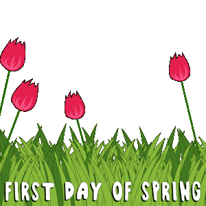 A cute blue penguin peeks from green grass with red tulips and a butterfly, celebrating the First Day of Spring.