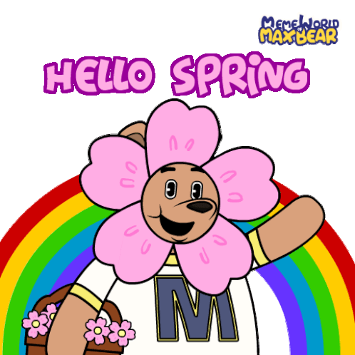 Maxbear, the flower-headed character, waves hello with a rainbow background, celebrating the arrival of spring.