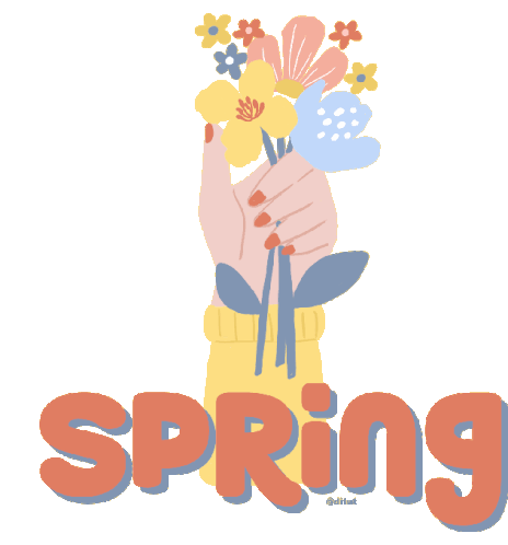 A stylized hand with red nail polish holds a vibrant bouquet of spring flowers, with the word 'SPRING' below.