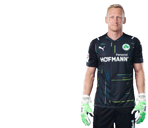 Sascha Burchert, the confident goalkeeper for SpVgg Greuther Fürth, stands proudly in his team jersey, ready for action.