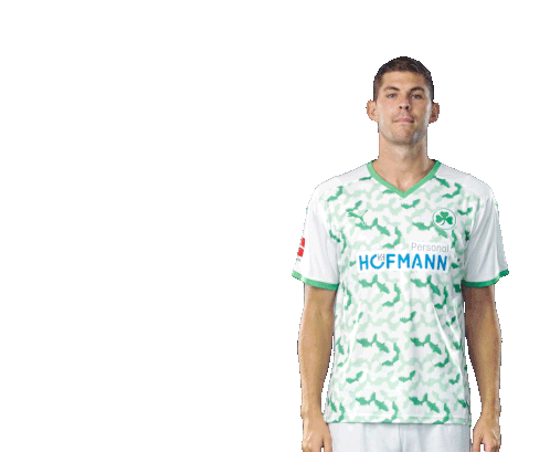 Emil Berggreen of SpVgg Greuther Fürth makes a VAR 'no goal' gesture, indicating a decision reversal.