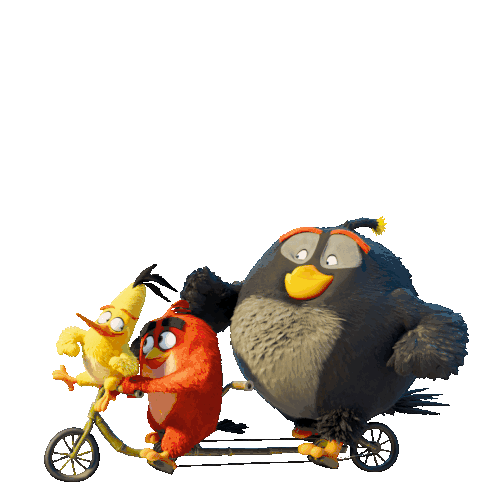 Red, Chuck, and Bomb from Angry Birds ride a tandem bike, celebrating friendship and squad goals with big smiles.