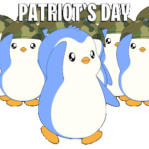 A squad of cute cartoon penguins in military helmets, with one saluting, celebrating Patriot's Day.
