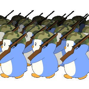 A marching squad of cartoon penguins, dressed in camouflage helmets and holding rifles, ready for action.