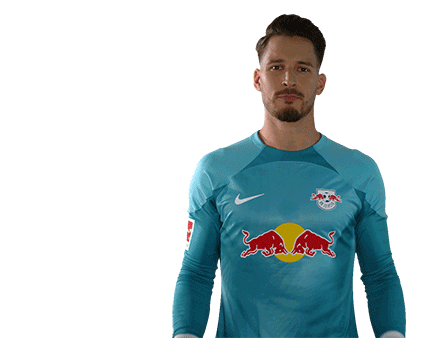 Janis Blaswich, the RB Leipzig goalkeeper, forms a square shape with his hands, then drops them. A playful gesture.