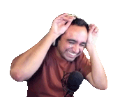 Squeex joyfully performs the Caramelldansen dance, wearing headphones and smiling with hands up.